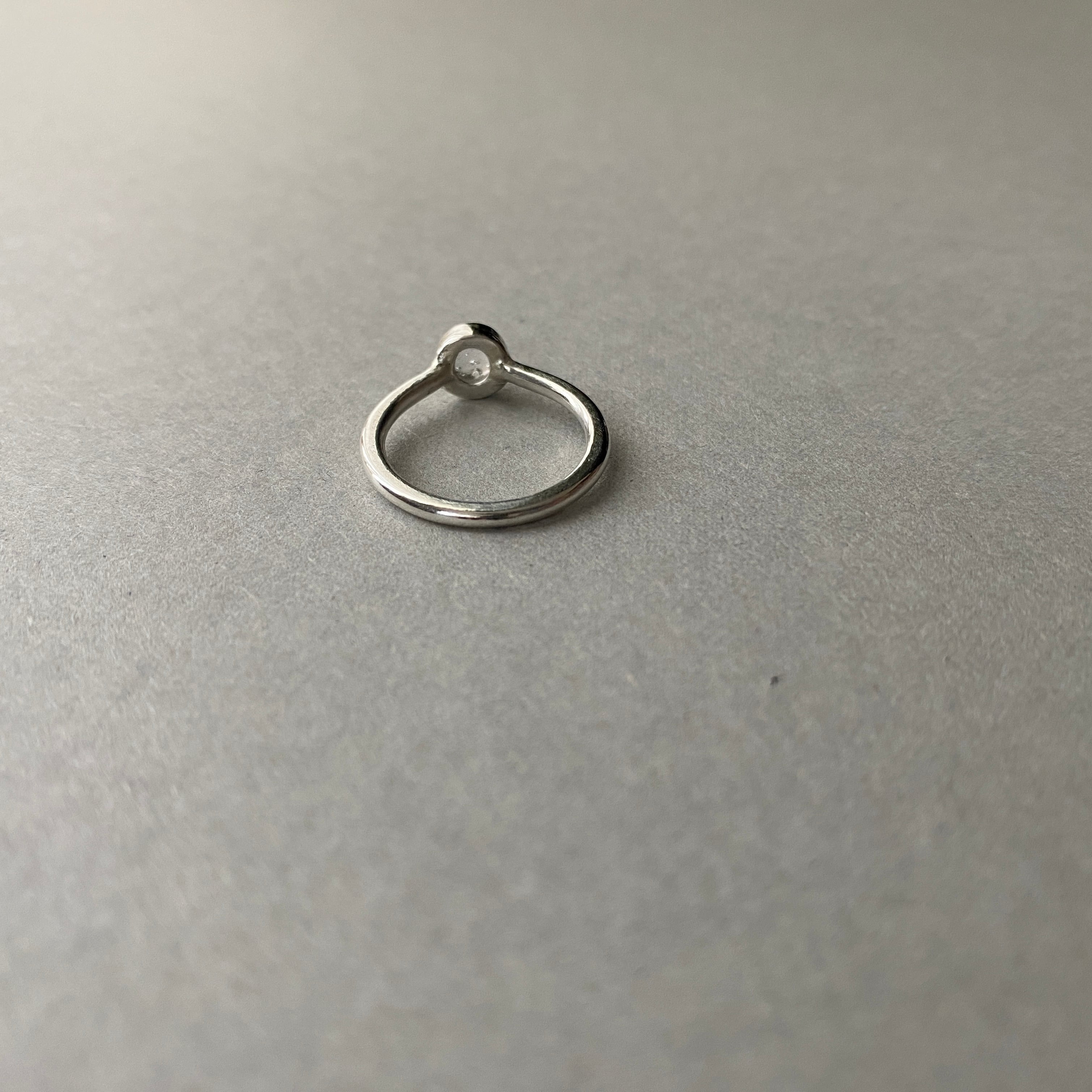 雨粒のようなクリアガラスの小さな粒をリングに仕立てました。定番モデルですが、ガラスの焼き上げの個体差によりすべて表情の異なる一点ものです。さりげなく身につけていただきやすいモデルです。
