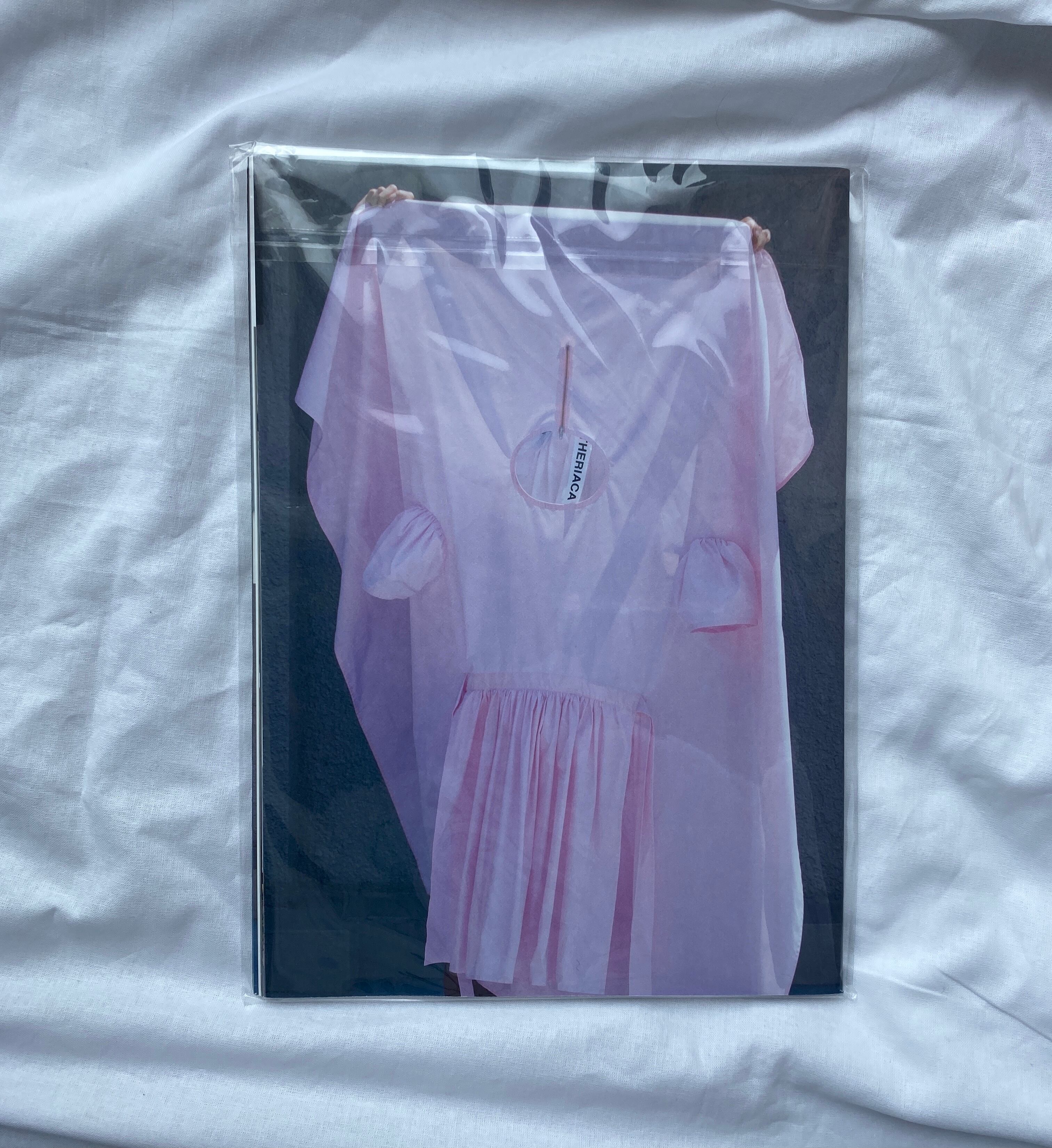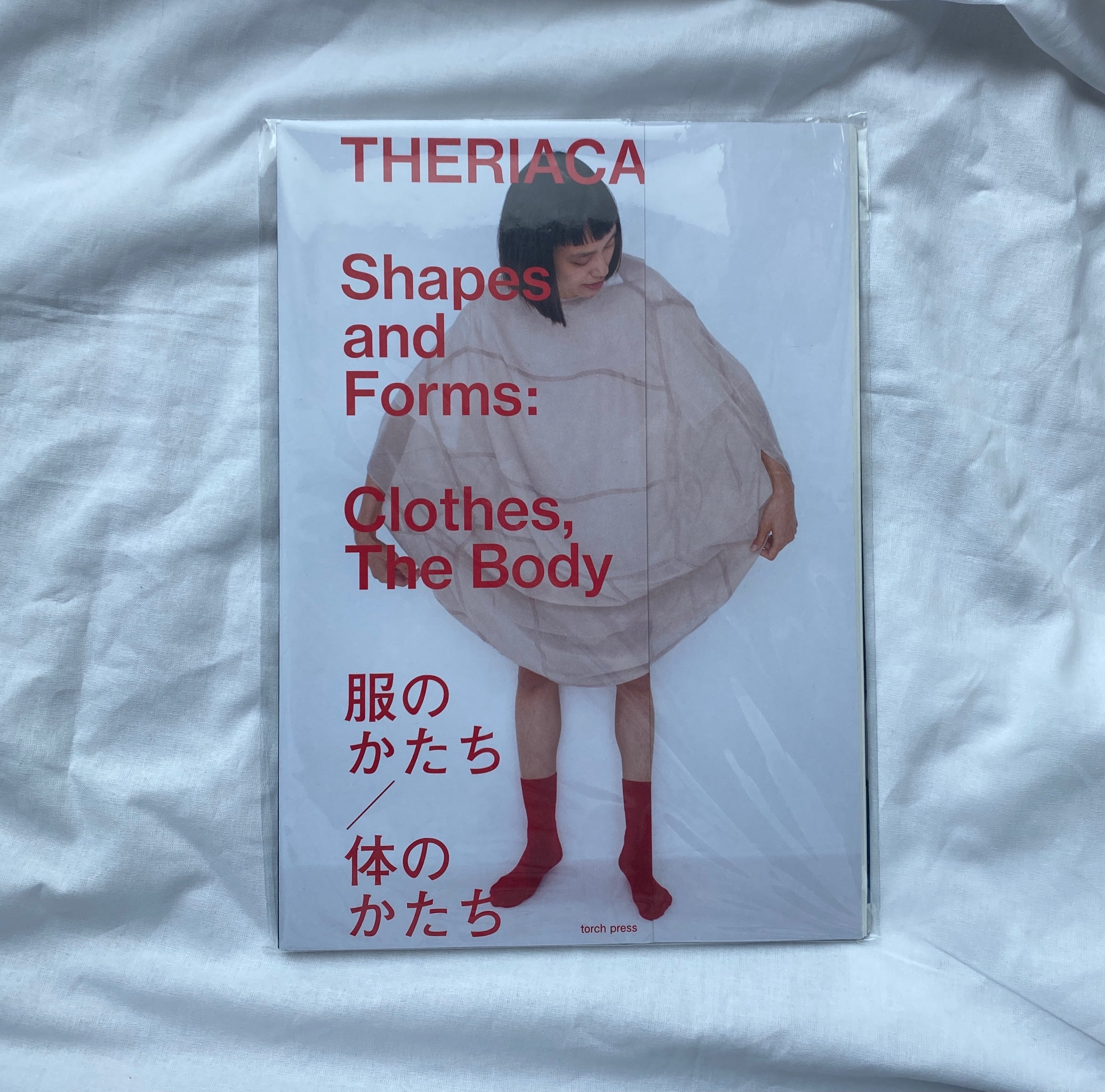 ソファやトイレットペーパーといった、私たちにとって身近な「もの」の形が衣服へと姿を変える「もののかたちの服」、一枚の布から着想を得て衣服へと変換する「ベットシーツの服」、丸や四角など幾何学的な形状を服にした「かたちの服」の3部で構成され、また濱田明日香のアイディアノートも挟み込んだ「THERIACA」初のアートブックとなります。私たちの知る「もの」でなく、また見慣れた服からも距離のある濱田の作品は、不思議な雰囲気を放ち、洗練されていながらどこかユーモラスでもあります。それらは服という言葉をイメージできる範囲を押し広げ、楽しさを提供しながら私たちに新しい服のあり方を提案してくれるのです。